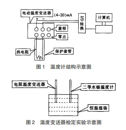 2 溫度變送器檢定辦法 (1)熱電阻溫度變送器一種整體裝置,可以對熱電阻以及溫度變送器分別進行檢定,從而滿足現(xiàn)場使用精度要求,也可把熱電阻溫度變送器整體進行校準??蛇x用一支標準熱電阻元件,溫度測量量程 0 ~ 100℃,再采用溫度變送器實現(xiàn)與熱電阻元件的匹配,再配置溫度為 20 ~ 300℃的恒溫場和冰點槽,具體配置如圖 2 所示。