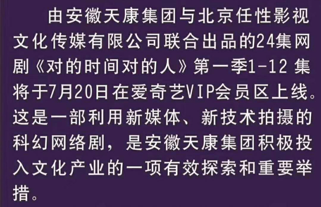最近,安徽天康集團(tuán)與影視公司聯(lián)合出品了24集的網(wǎng)絡(luò)劇,據(jù)介紹,這是一部利用新媒體、新技術(shù)拍攝的科幻網(wǎng)絡(luò)劇,是安徽天康集團(tuán)積極投入文化產(chǎn)業(yè)的一項(xiàng)有效探索和重要舉措。